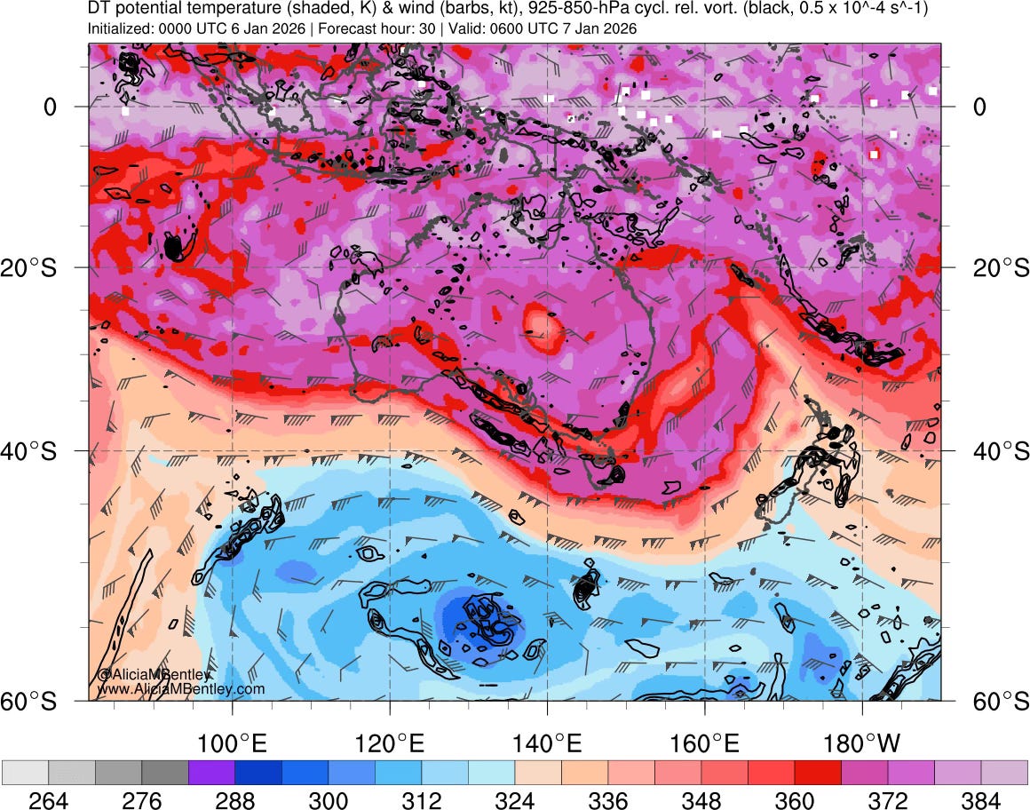 In this heatwave, “blocking” is not the cause. Instead, there are two separate upper-tropospheric anticyclones (ridges) that appear, driving descent and heat into the southeast. This repeated ridging can readily be seen in the maximum temperature forecast for Melbourne issued by the Bureau of Meteorology (valid Tuesday 06/01/26). The first upper ridge coincides with a maximum temperature forecast of 42C for Wednesday (07/01/26) sees an expected maximum of 42C, while the second coincides with a maximum temperature forecast of 40C for Friday (09/01/26). However between these two events as the second ridge begins to form, is some relief (at least for areas adjacent to the coastline) with a maximum temperature forecast for Melbourne of only 29C on Thursday (098/01/26).